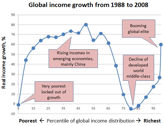On a global scale, the following chart situates the American working class within the global income distribution. The income of those at the top – the owners of capital – has grown rapidly as globalization has provided capital with access to cheap labor outside of Europe and North America. Incomes have also grown rapidly in emerging economies – such as China – where previously impoverished workers have gained access to the kind of factory jobs that Americans enjoyed in decades past. The group that has experienced no gains are the workers of North America and Europe. While this group remains well off in both absolute and relative terms, it has fallen behind, over time, in comparison with the highly educated global elite and the rising working class of the developing world.