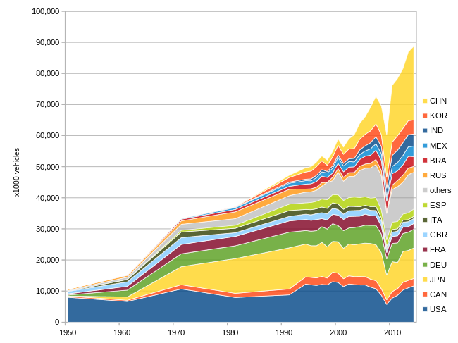 How things have changed. Consider, for instance, the automobile industry. As the chart below illustrates, US auto production dwarfed that of any other country in the 1950s and 1960s. Today, however, US-based auto production remains about where it was six decades ago while production elsewhere around the globe has skyrocketed. China now produces twice as many vehicles as the United States. It is similar in other industries.