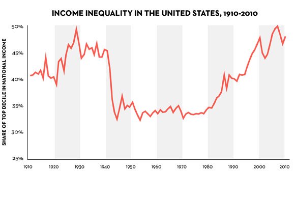 The current level of income inequality rivals that of the 1920s and far exceeds the relatively equitable distribution of the middle of the 20th century.