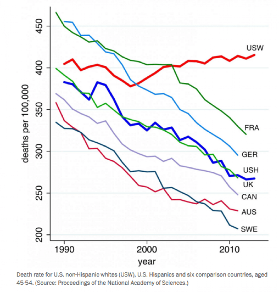 In a sign of growing social distress, the death rate among middle-aged white males in the US has risen over the past decade, in contrast with the usual pattern of falling death rates (see red line in chart below).